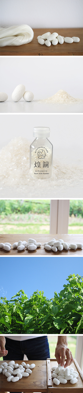 従来、「フィブロイン」は、水に溶けないタンパク質と考えられていましたが、『松田養蚕場』設立者の松田道夫氏は独自の特許技術により、世界で初めて、水に溶ける美容成分「水溶性フィブロイン『煌繭(きらまゆ)』」の開発に成功しました。