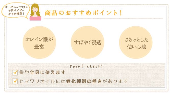 髪も肌もしっとり落ち着く万能オイル太陽のエネルギーをふんだんにつめこんだヒマワリのオイルです。原料となるヒマワリは伝統的な品種改良法で生まれたハイオレイック・ヒマワリで、その種から採れるオイルは植物油の中でオレイン酸含有量がもっとも多いのが特長。皮脂の大半の成分と同じなので肌に素早く浸透します。同じようにオレイン酸豊富な椿油と同様、髪にもからだにも顔にもオールマイティに使えます。椿油よりさらっとしていてよく伸びるので、オイリー肌やニキビがある人でも使いやすいでしょう。またヒマワリオイルには生理活性の高い「アルファ体」も豊富に含まれるため、フリーラジカルから細胞を守り、老化を抑制してくれます。