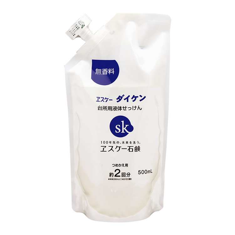 804580-01:290ml 804580-02:つめかえ用(2回分) 500ml 用途:食器、調理器具用 全成分:純石けん分(32% 脂肪酸カリウム)〈成分情報〉水(工程剤)、脂肪酸カリウム(界面活性剤)、グリセリン(工程剤)、グルコン酸ナトリウム(pH調整剤)、クエン酸カリウム(pH調整剤) 液性:弱アルカリ性 エスケー石鹸について 『エスケー石鹸』の創業は1918年。「良品に非ずんば、売らず」をモットーに製品を作り続けています。せっけんは、排水後1日で分解されるため、環境を汚染しません。環境にとっても、使う人にとっても安全でやさしいせっけんは、今あらためて見直されています。