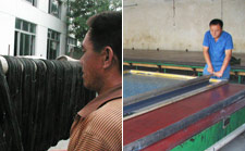 山東省では、糸紡ぎは農家のおばあさん達の仕事です。おばあさんたちは5~6歳の少女の頃から ずっと紡いでいるそうです。糸の太さの違いは指先の感覚だけが頼り。手紡ぎの糸があんなにやさしいのは、おばあさんの気持ちが指先から糸に伝わるからかもしれません。一日に紡げるのはわずか200g。綿番手の10番単糸から30番単糸までを紡ぐことのできる、すばらしい技術です。