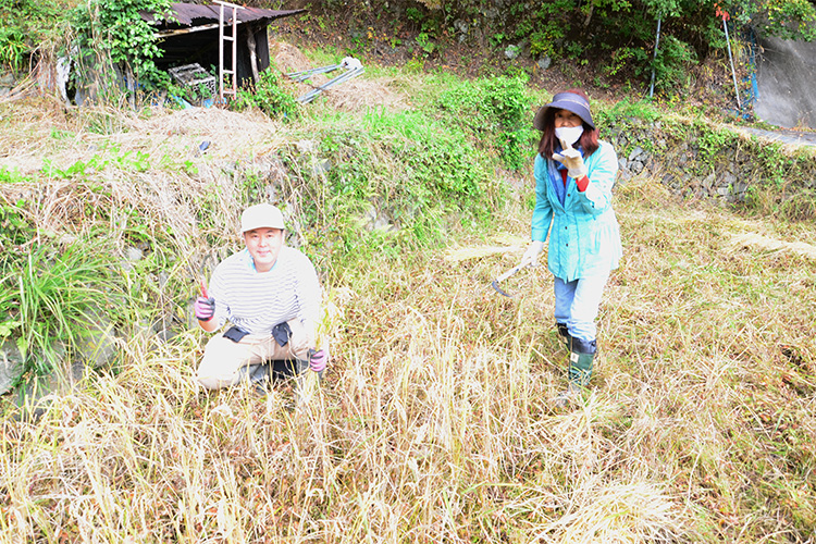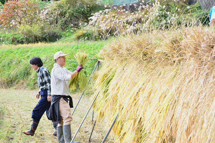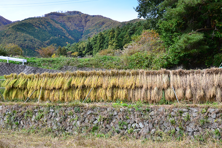 酷暑の夏にはヒエが水田に大量発生。綺麗な水を守るために始めた無農薬米なので暑さと闘いながら草取りをしました。そのかいあってお米は順調に実りました。天日干しにすると日差しの中できらきらと金色に輝いて幸せ心地に。
