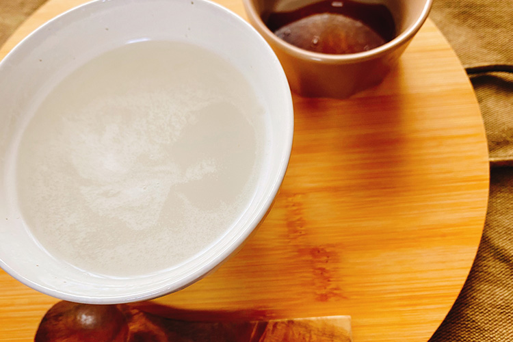「葛ゆ」は、葛粉にお湯を注いだだけで作れる、とろみのある飲み物。これに甘みをつけて飲みます。