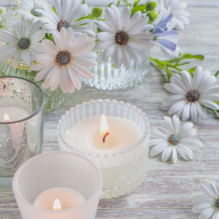 部屋を暗くして、キャンドルを灯し、かすかに揺れる炎に視線を集中します。雑念が生じにくくなり、副交感神経優位に導きやすくなります。