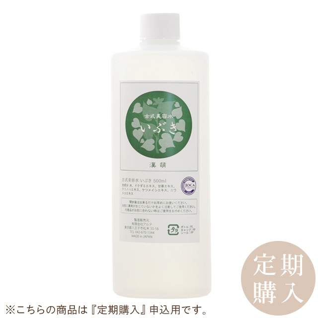 コンディショニング美容水 いぶきは、一切の化学合成成分を添加せず、日本に育つ天然の美容植物を原料に、昔ながらの"水"と"火"のみを用いた特殊製法で手造りした低刺激の美容水です。十薬・甘草・栗の葉・ハブ草・ニワトコを丸ごと材料に 特殊蒸留法によって、ゆっくりと仕上げました。浸透性に優れた天然有機酸の働きで角質層を引き締めて補強します。水のようなサラサラの美容水で、自然の消炎作用で不調な肌をやさしく整えます。敏感肌、ニキビ肌のケアにも適しています。また痒みなどを和らげてくれます。