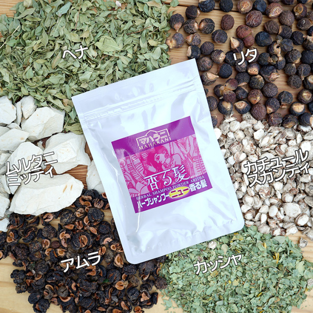 成分名:アンマロク。野生のアムラを使用。髪にハリとコシを与え、頭皮と髪を清潔に保ちます。シカカイと一緒に使うことで、絶妙な仕上がりになります。